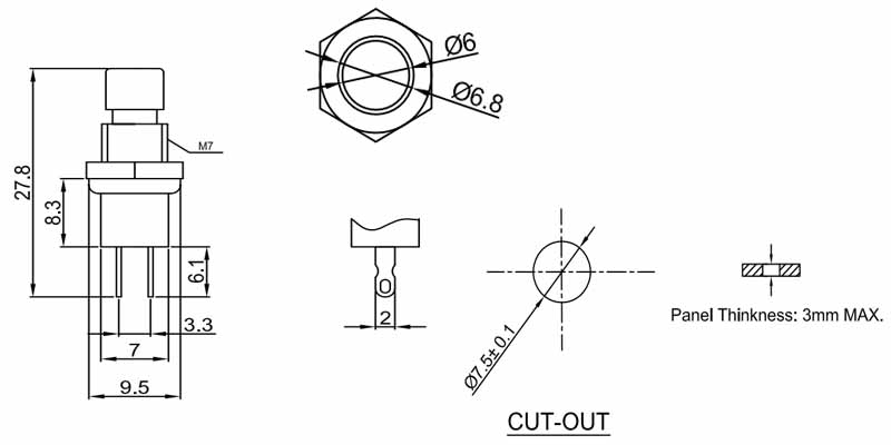 按鍵開關PB05系列,迷你型安裝孔7.5mm,瞬間型 常開,常閉,帶鎖型ON-OFF等功能,占空間小,功能全,一般用于消費性電器產品,儀表儀器等